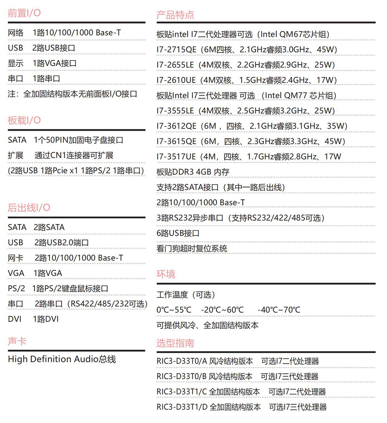 采 用Intel? I7二 代 , 三 代 處 理 器 設 計 方 案 ,CompactPCI 3U架 構 , 符 合 PICMG2.0 R3.0標準具備豐富的外圍接口;設計了高效的散熱系統,可顯著提 高處理器的浮點運算性能,以太網、PCIe TO PCI擴展總線、滿足視頻采集與處 理等應用對高速數據傳輸的要求。專為惡劣環境使用而設計,滿足無人機、裝 甲車、水面艦艇等應用需求。