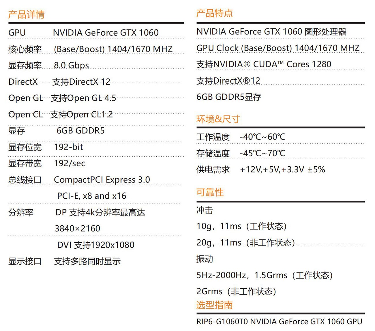 一款CPCI-E獨立顯卡,采用NVIDIA GeForce GTX 1060圖形芯片, 顯存時鐘為8.0 GBPS為192Bit 6G GDDR5顯存 支持Open GL 4.5支持 DirectX 12支持Open CL 1.2支持NVIDIA? CUDA? Cores 1280 等技術(shù);具有出色多顯示輸出接口、該產(chǎn)品有良好計算和圖形性能,適合高性能的應(yīng)用場合,這使得顯示模塊能夠應(yīng)對最復(fù)雜的并行應(yīng)用程序,比如地形 繪圖雷達導(dǎo)航和氣象繪圖,面部和手勢識別,以及生物識別分析等。